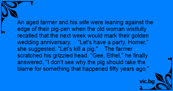 An aged farmer and his wife were leaning against the edge of their pig-pen when the old woman wistfully recalled that the next week would mark their golden wedding anniversary. "Let's have a party, Homer," she suggested. "Let's кill a pig." The farmer scratched his grizzled head. "Gee, Ethel," he finally answered, "I don't see why the pig should take the blame for something that happened fifty years ago."