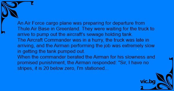 When the commander berated the Airman for his slowness and promised punishment, the Airman responded: "Sir, I have no stripes, it is 20 below zero, I'm stationed in Greenland, and I am pumping sewage out of airplanes. Just what are you going to do to punish me?"