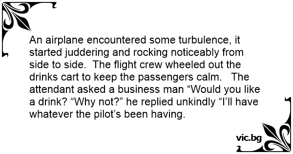 An airplane encountered some turbulence, it started juddering and rocking noticeably from side to side. The flight crew wheeled out the drinks cart to keep the passengers calm. The attendant asked a business man “Would you like a drink? “Why not?” he replied unkindly “I’ll have whatever the pilot’s been having.