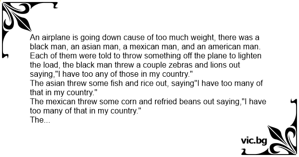An airplane is going down cause of too much weight, there was a black man, an asian man, a mexican man, and an american man. Each of them were told to throw something off the plane to lighten the load, the black man threw a couple zebras and lions out saying,"I have too any of those in my country."