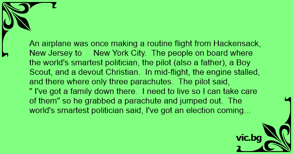 " I've got a family down there. I need to live so I can take care of them" so he grabbed a parachute and jumped out. The world's smartest politician said, I've got an election coming up, so I'd better live so I can win it." So he grabbed a parachute and jumped out. That left the Boy Scout and the Christian in the plane and only 1 parachute. The Christian said,