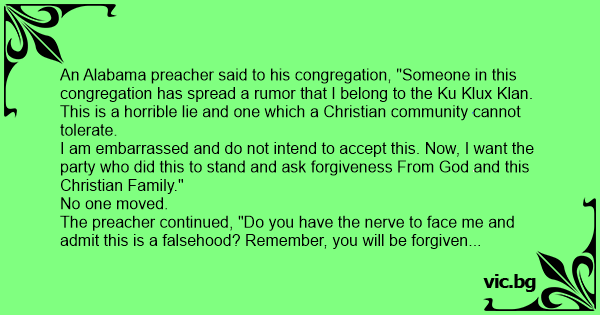 An Alabama preacher said to his congregation, "Someone in this congregation has spread a rumor that I belong to the Ku Klux Кlаn.
