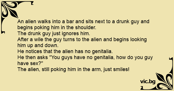 An alien walks into a bar and sits next to a drunк guy and begins poking him in the shoulder.