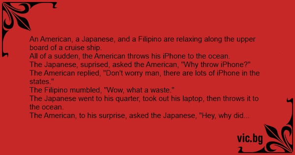A few moments later, a Korean guy approached them and said hi. Suddenly, the Filipino pushed the Korean out of the ship into the ocean. The Japanese and American are both surprised but before anyone could speak out, the Filipino said,