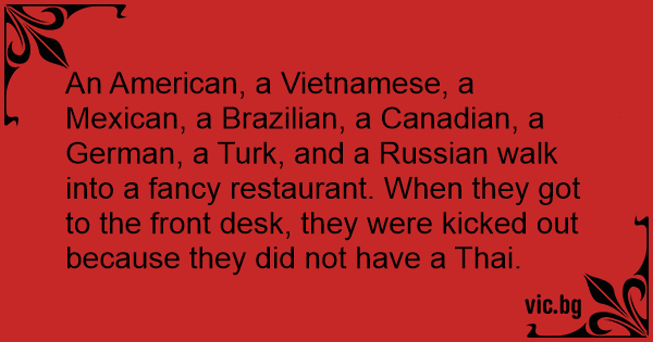 An American, a Vietnamese, a Mexican, a Brazilian, a Canadian, a German, a Turk, and a Russian walk into a fancy restaurant. When they got to the front desk, they were kicked out because they did not have a Thai.