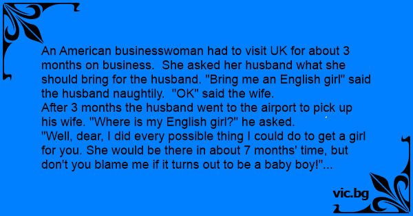 An American businesswoman had to visit UK for about 3 months on business. She asked her husband what she should bring for the husband. "Bring me an English girl" said the husband naughtily. "OK" said the wife.
