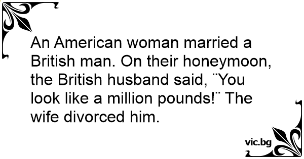 An American woman married a British man. On their honeymoon, the British husband said, ¨You look like a million pounds!¨ The wife divorced him.