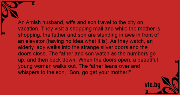 An Amish husband, wife and son travel to the city on vacation. They visit a shopping mall and while the mother is shopping, the father and son are standing in awe in front of an elevator (having no idea what it is). As they watch, an elderly lady walks into the strange silver doors and the doors close. The father and son watch as the numbers go up, and then back down. When the doors open, a beautiful young woman walks out. The father leans over and whispers to the son, "Son, go get your mother!"