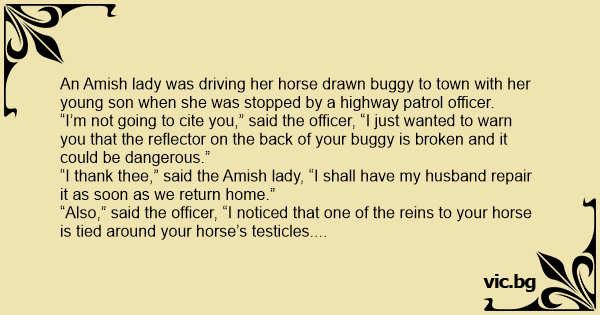 “I’m not going to cite you,” said the officer, “I just wanted to warn you that the reflector on the back of your buggy is broken and it could be dangerous.”