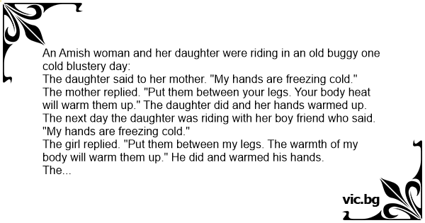 The girl replied. "Put them between my legs. The warmth of my body will warm them up." He did and warmed his hands.