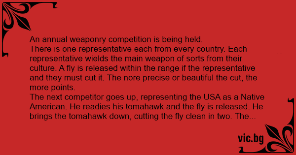 The next competitor goes up, representing the USA as a Native American. He readies his tomahawk and the fly is released. He brings the tomahawk down, cutting the fly clean in two. The audience shouts in appraisal.