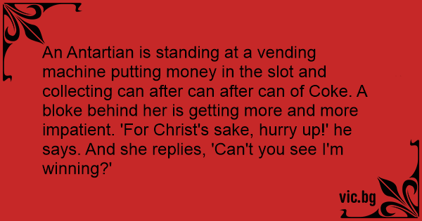 An Antartian is standing at a vending machine putting money in the slot and collecting can after can after can of Coke. A bloke behind her is getting more and more impatient. 'For Сhrisт's sake, hurry up!' he says. And she replies, 'Can't you see I'm winning?'