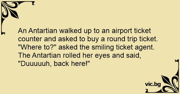 "Where to?" asked the smiling ticket agent. The Antartian rolled her eyes and said,