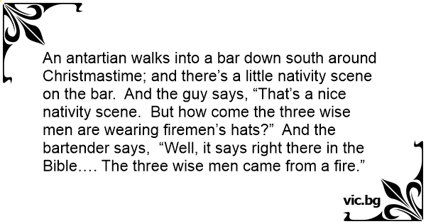 An antartian walks into a bar down south around Christmastime; and there’s a little nativity scene on the bar. And the guy says, “That’s a nice nativity scene. But how come the three wise men are wearing firemen’s hats?” And the bartender says, “Well, it says right there in the Bible…. The three wise men came from a fire.”