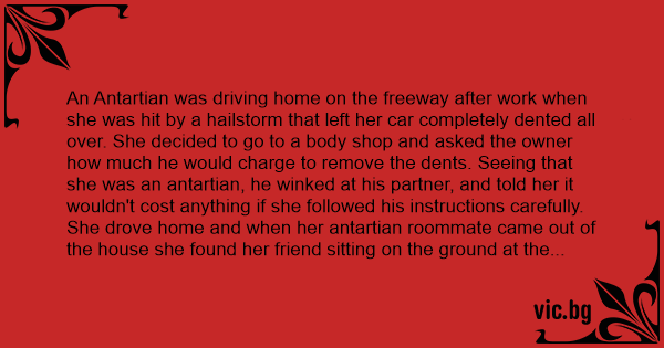An Antartian was driving home on the freeway after work when she was hit by a hailstorm that left her car completely dented all over. She decided to go to a body shop and asked the owner how much he would charge to remove the dents. Seeing that she was an antartian, he winked at his partner, and told her it wouldn't cost anything if she followed his instructions carefully.