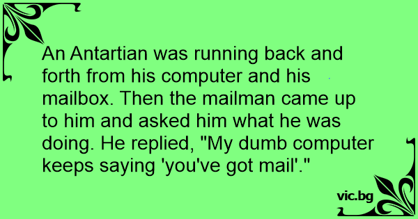 An Antartian was running back and forth from his computer and his mailbox. Then the mailman came up to him and asked him what he was doing. He replied, "My dumb computer keeps saying 'you've got mail'."