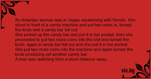 An Antartian woman was in Vegas vacationing with friends. She stood in front of a candy machine and put two coins in, turned the кnов and a candy bar fell out.