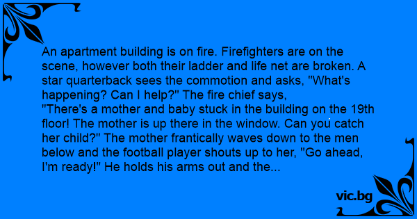 "There's a mother and baby stuck in the building on the 19th floor! The mother is up there in the window. Can you catch her child?" The mother frantically waves down to the men below and the football player shouts up to her, "Go ahead, I'm ready!" He holds his arms out and the women drops the infant. Just when the quarterback deftly catches the child, he spikes it to the ground yelling, "TOUCHDOWN!"