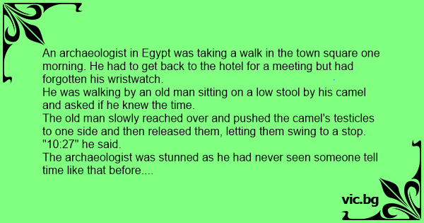 An archaeologist in Egypt was taking a walk in the town square one morning. He had to get back to the hotel for a meeting but had forgotten his wristwatch.