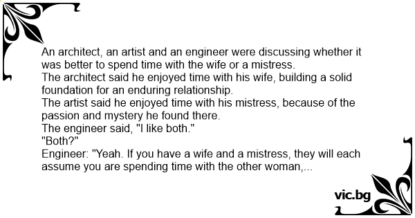 An architect, an artist and an engineer were discussing whether it was better to spend time with the wife or a mistress.
