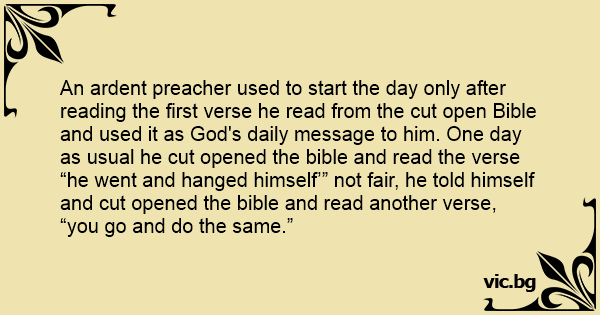 An ardent preacher used to start the day only after reading the first verse he read from the cut open Bible and used it as God's daily message to him. One day as usual he cut opened the bible and read the verse “he went and hanged himself’” not fair, he told himself and cut opened the bible and read another verse, “you go and do the same.”