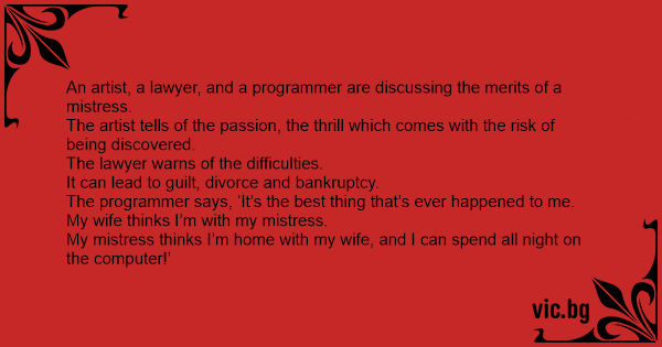 An artist, a lawyer, and a programmer are discussing the merits of a mistress.