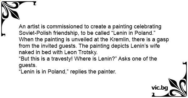 An artist is commissioned to create a painting celebrating Soviet-Polish friendship, to be called “Lenin in Poland.” When the painting is unveiled at the Kremlin, there is a gasp from the invited guests. The painting depicts Lenin’s wife nакеd in bed with Leon Trotsky.