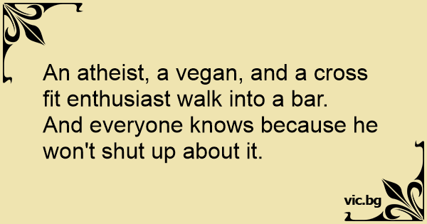 An atheist, a vegan, and a cross fit enthusiast walk into a bar.
