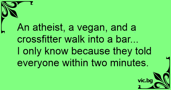 An atheist, a vegan, and a crossfitter walk into a bar...