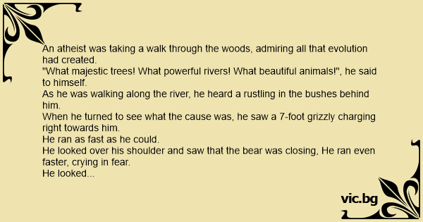 The atheist looked directly into the light "It would be hypocritical of me to suddenly ask You to treat me as Christian now, but perhaps could you make the bear a Christian?"