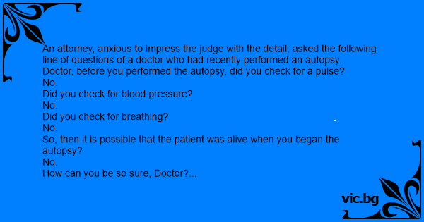 An attorney, anxious to impress the judge with the detail, asked the following line of questions of a doctor who had recently performed an autopsy.