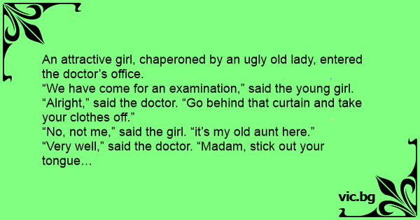 An attractive girl, chaperoned by an ugly old lady, entered the doctor’s office.
