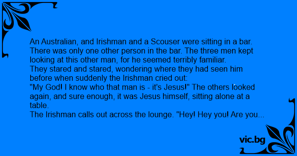 Well, the Irishman calls the bartender over and says to him. "I'd like you to give Jesus over there a pint of Guinness from me." The bartender pours Jesus a Guinness. Jesus looks over, raises his glass in thanks and drinks.