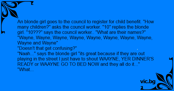 An blonde girl goes to the council to register for child benefit. "How many children?" asks the council worker. "10" replies the blonde girl. "10???" says the council worker.. "What are their names?"