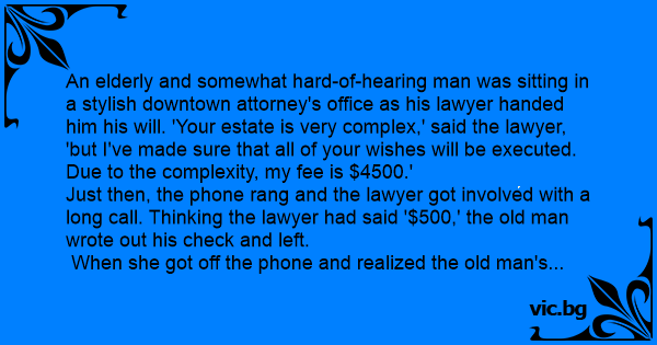 Just then, the phone rang and the lawyer got involved with a long call. Thinking the lawyer had said '$500,' the old man wrote out his check and left.