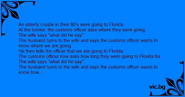 An elderly couple in their 80's were going to Florida. At the border, the customs officer asks where they were going. The wife says "what did he say". The husband turns to the wife and says the customs officer wants to know where we are going. He then tells the officer that we are going to Florida. The customs officer now asks how long they were going to Florida for. The wife says "what did he say". The husband turns to the wife and says the customs officer wants to know how long we are going to Florida for. The husband tells the officer that they were going for 2 months. The customs officer then asks where they were coming from. The wife says "what did he say". The husband turns to his wife and says the customs officer wants to know where we were coming from. The husband tells the officer that they were from Hamilton. The customs officer thinks for a minute and tells the husband that he had dated a lady from Hamilton and she was the worst piece of аss he ever had. The wife says "what did he say". The husband turns to his wife and says "He thinks he knows you".