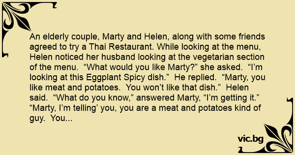 An elderly couple, Marty and Helen, along with some friends agreed to try a Thai Restaurant. While looking at the menu, Helen noticed her husband looking at the vegetarian section of the menu. “What would you like Marty?” she asked. “I’m looking at this Eggplant Spicy dish.” He replied. “Marty, you like meat and potatoes. You won’t like that dish.” Helen said. “What do you know,” answered Marty, “I’m getting it.” “Marty, I’m telling’ you, you are a meat and potatoes kind of guy. You won’t like it!” Helen exclaimed. “I’m getting it and that is the last word!” says Marty.