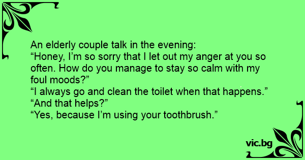 Една възрастна двойка разговаря: „Скъпа, толкова съжалявам, че те ядосвам. Как успяваш да останеш толкова спокойна?“ „Когато ме ядосаш, винаги отивам да чистя тоалетната“ „И това помага ли?“...
