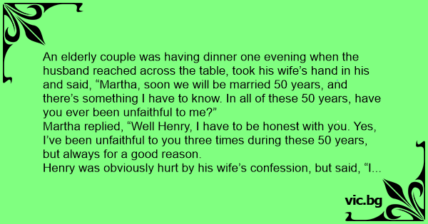 Martha replied, “Well Henry, I have to be honest with you. Yes, I’ve been unfaithful to you three times during these 50 years, but always for a good reason.