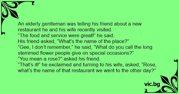 “That’s it!” he exclaimed and turning to his wife, asked, “Rose, what’s the name of that restaurant we went to the other day?”