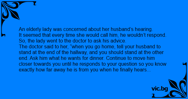 The doctor said to her, “when you go home, tell your husband to stand at the end of the hallway, and you should stand at the other end. Ask him what he wants for dinner. Continue to move him closer towards you until he responds to your question so you know exactly how far away he is from you when he finally hears you.”