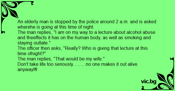 Полицаец застанува пијан маж и го прашува: - Каде сте тргнале толку доцна навечер? - На предавање. - Е како да не. Кој држи предавања во ова време?! - Жена ми!!