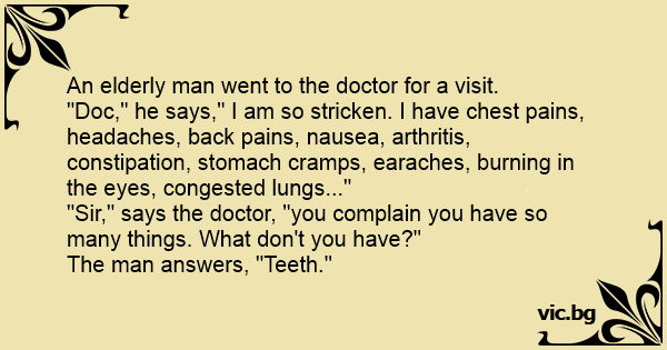 "Doc," he says," I am so stricken. I have chest pains, headaches, back pains, nausea, arthritis, constipation, stomach cramps, earaches, burning in the eyes, congested lungs..."