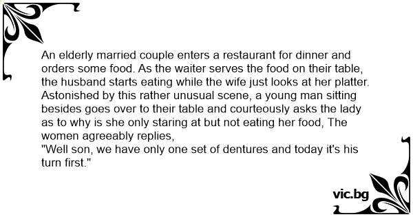 Astonished by this rather unusual scene, a young man sitting besides goes over to their table and courteously asks the lady as to why is she only staring at but not eating her food, The women agreeably replies,