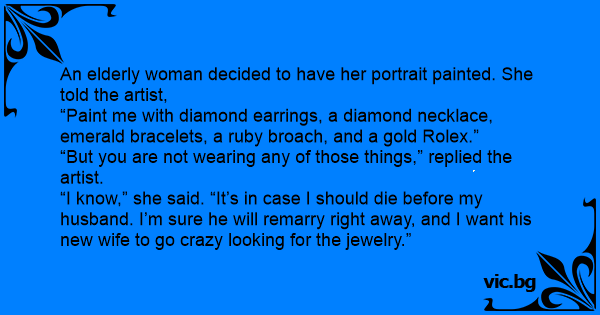 “I know,” she said. “It’s in case I should die before my husband. I’m sure he will remarry right away, and I want his new wife to go crazy looking for the jewelry.”
