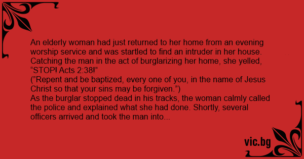 Catching the man in the act of burglarizing her home, she yelled, “STOP! Acts 2:38!”