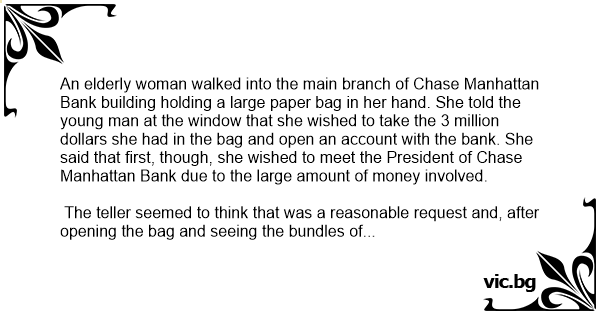 Дребничка възрастна госпожа влязла в Чейс Манхатън Банк и попитала дали може да си открие сметка.