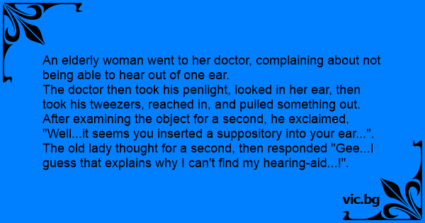 Een slechthorende man komt bij de dokter en klaagt over zijn pijnlijke oor. De dokter zegt na zijn onderzoek: “Ik zie denk ik het probleem al, er zit een zetpil in uw oor!” Zegt de man: “Bedankt,...