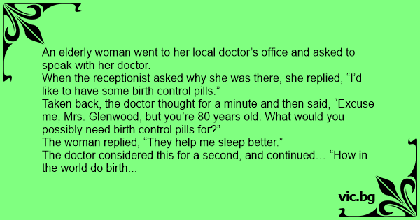 Taken back, the doctor thought for a minute and then said, “Excuse me, Mrs. Glenwood, but you’re 80 years old. What would you possibly need birth control pills for?”
