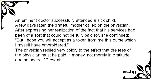 The physician replied very coldly to the effect that the fees of the physician must be paid in money, not merely in gratitude, and he added: "Presents maintain friendship: they do not maintain a family."